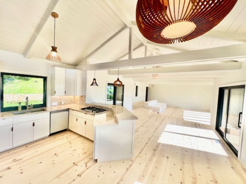 The main home features an open-concept layout with soaring ceilings, exposed beams, and new wood-style flooring. Walls of glass fill the space with natural light and stunning vistas. The modern kitchen includes granite countertops, stainless steel appliances, and ample cabinetry, flowing into the dining and living areas with sunset views.