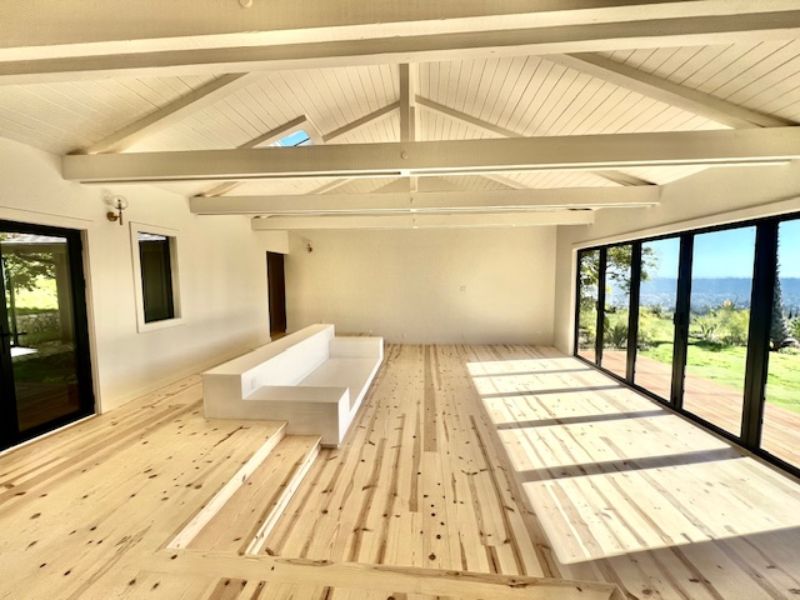 The main home features an open-concept layout with soaring ceilings, exposed beams, and new wood-style flooring. Walls of glass fill the space with natural light and stunning vistas. The modern kitchen includes granite countertops, stainless steel appliances, and ample cabinetry, flowing into the dining and living areas with sunset views.